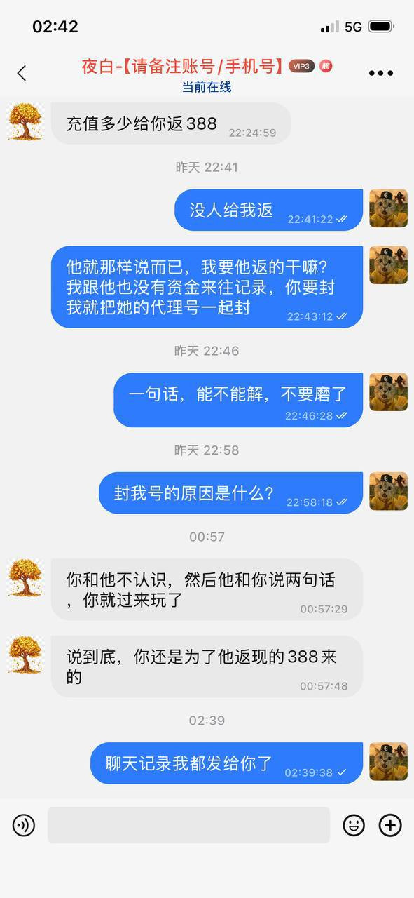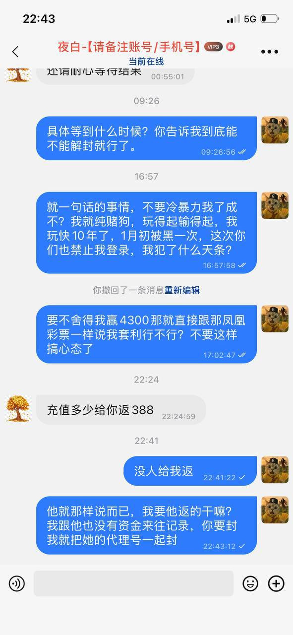 在线客服甩锅让我加旺商聊客服(259999),加了之后一天回一句废话,永远不在正题上,各种系统检测、审核中、托词拉扯。代理也他妈出尔反尔,翻脸不认人,几千块钱跟要他们命一样,死活不给出。