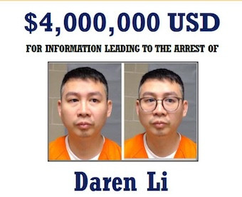 操,美国这次下血本了!今天直接开出400万美元悬赏,通缉在逃的李大仁(Daren Li)。